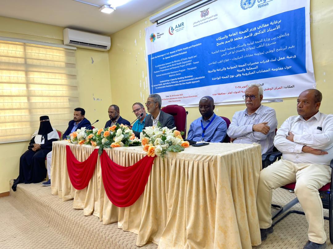 اختتمت بالعاصمة المؤقتة عدن، اليوم، فعاليات ورشة عمل بناء قدرات مختبرات الصحة الحيوانية، والزراعية، والثروة السمكية، والبيئة حول مقاومة مضادات الميكروبات وفق نهج الصحة الواحدة، التي نظمها البرنامج الوطني لمقاومة مضادات الميكروبات بوزارة الصحة العامة والسكان، بمشاركة ممثلين من الوزارات والجهات ذات العلاقة، ومنظمتي الصحة العالمية (WHO) والأغذية والزراعة للأمم المتحدة (FAO).