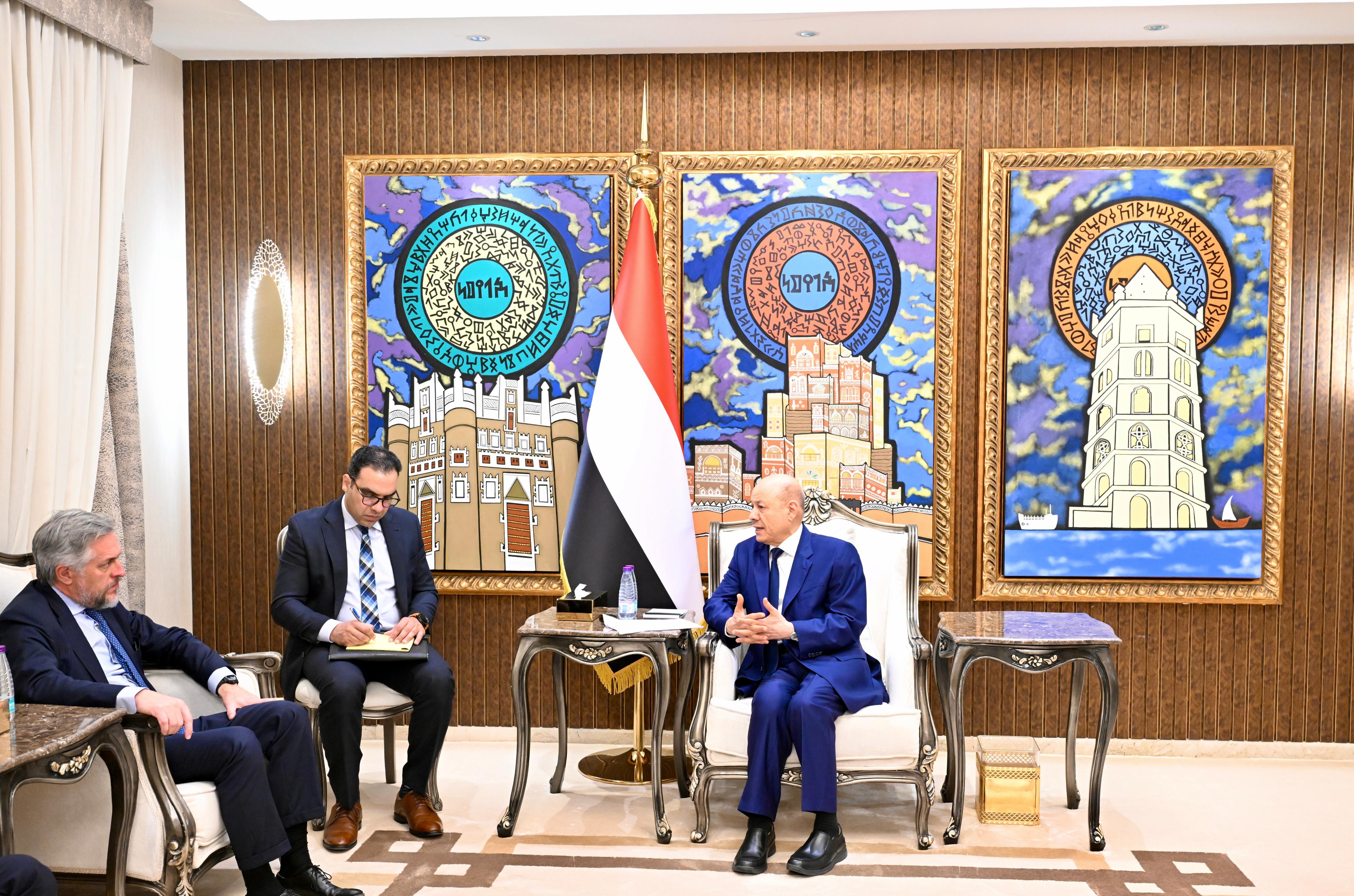 استقبل فخامة الرئيس الدكتور رشاد محمد العليمي، رئيس مجلس القيادة الرئاسي، اليوم الخميس، رئيس بعثة الاتحاد الاوروبي، باتريك سيمونيه، للبحث في علاقات التعاون والشراكة، اضافة الى مستجدات الاوضاع على الساحة الوطنية، والدعم الاوروبي المطلوب لجهود الحكومة في بناء القدرات، وتحسين الخدمات واستعادة الثقة بالمؤسسات التمويلية الدولية.