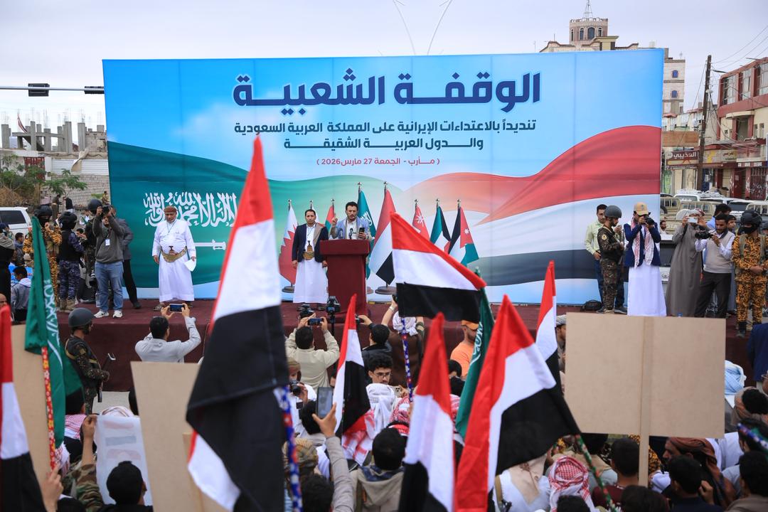 شهدت محافظة مأرب، اليوم، وقفة شعبية جماهيرية حاشدة، بمشاركة قيادات سياسية وقبلية وممثلين عن منظمات المجتمع المدني، تنديدًا بالاعتداءات الإيرانية المتكررة على المملكة العربية السعودية وعدد من الدول العربية الشقيقة، وذلك بالتزامن مع الذكرى الحادية عشرة لانطلاق عملية "عاصفة الحزم" لتحالف دعم الشرعية بقيادة المملكة العربية السعودية.
