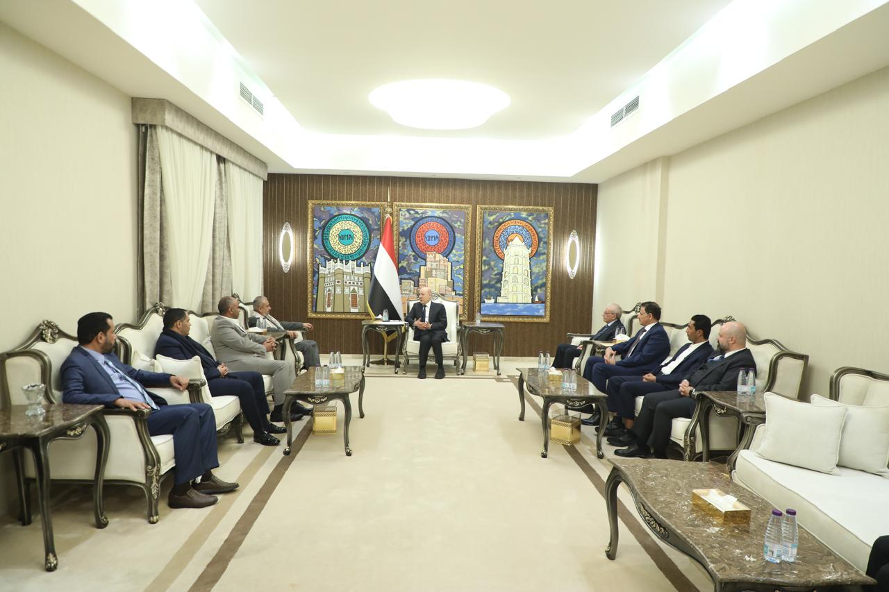 His Excellency President Dr. Rashad al-Alimi, Chairman of the Presidential Leadership Council (PLC) received today, Thursday, the negotiating government delegation tasked with the detainees' file, headed by Shoura Council member Hadi Heig.