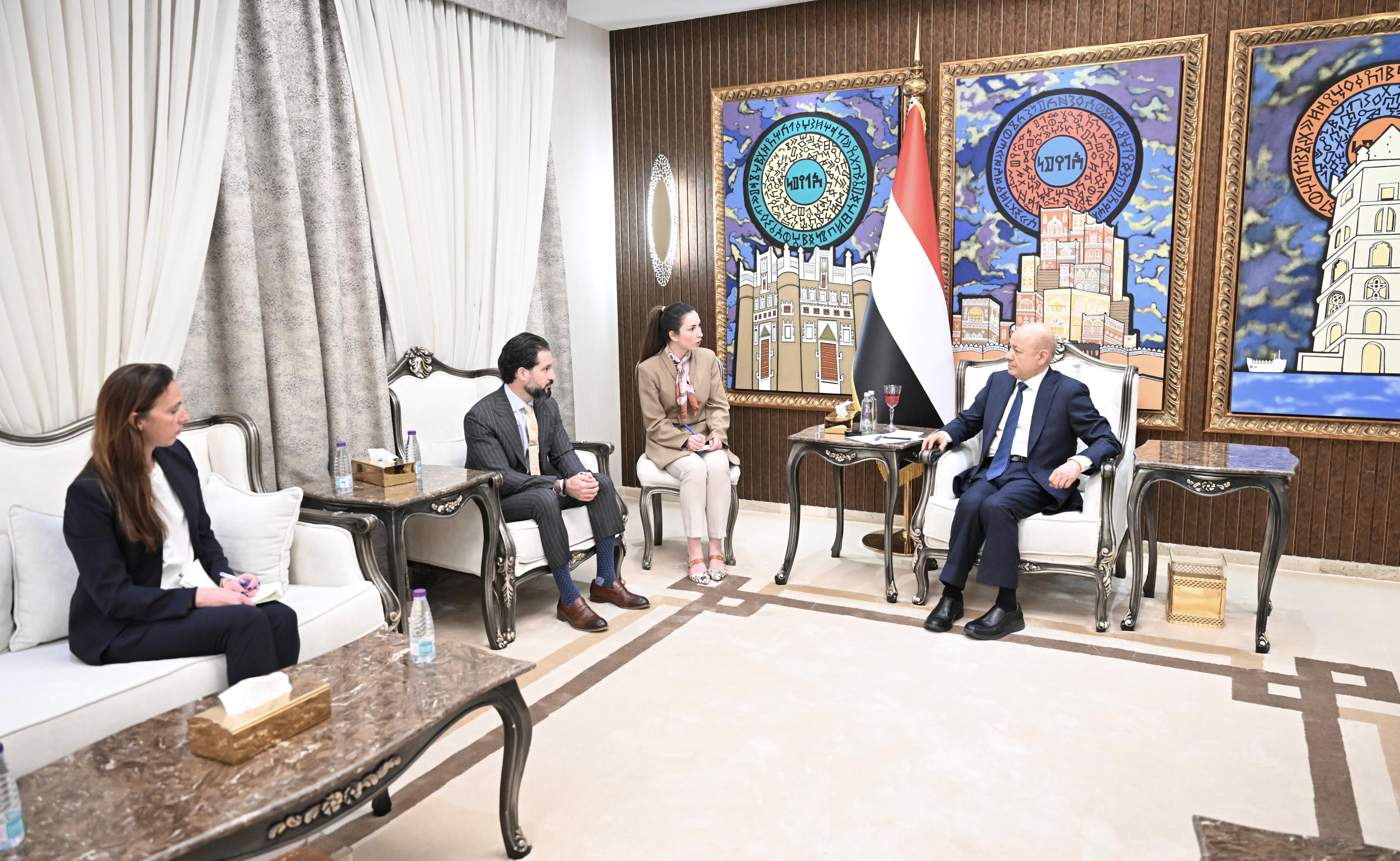 His Excellency President Dr. al-Alimi, Chairman of the Presidential Leadership Council (PLC) received today, Tuesday, the Chargé d' Affaires of the United States Embassy in the Republic of Yemen Jonathan Pecha.